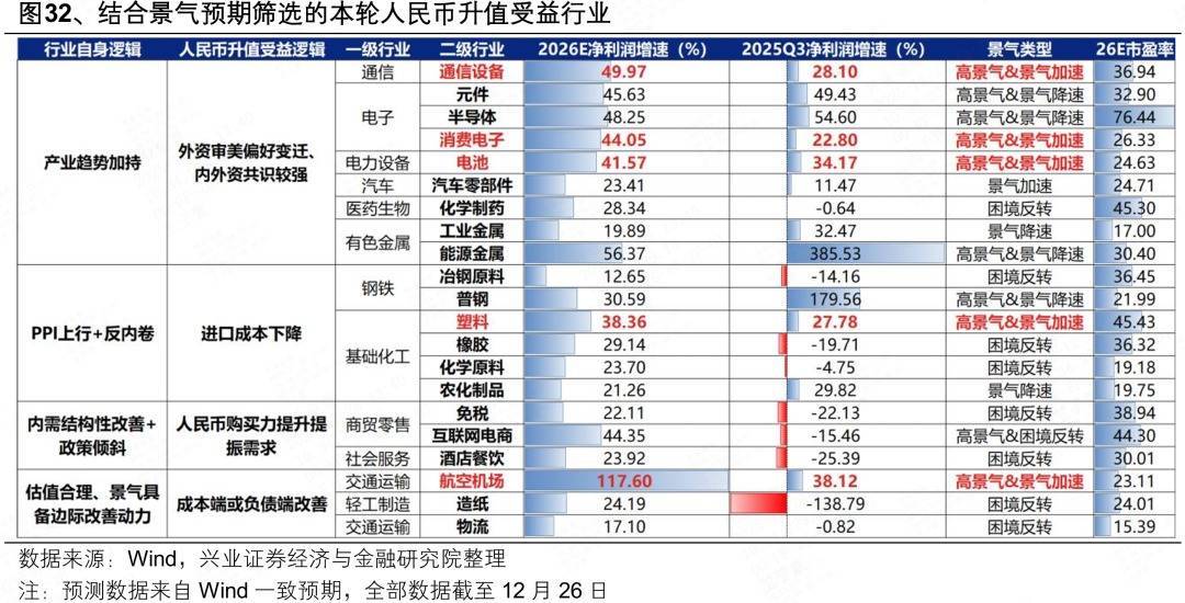 4)当前估值合理、明年景气具备边际改善动力、且有望受益于人民币升值带来的成本端或负债端改善的行业,包括航空机场、造纸、物流等。